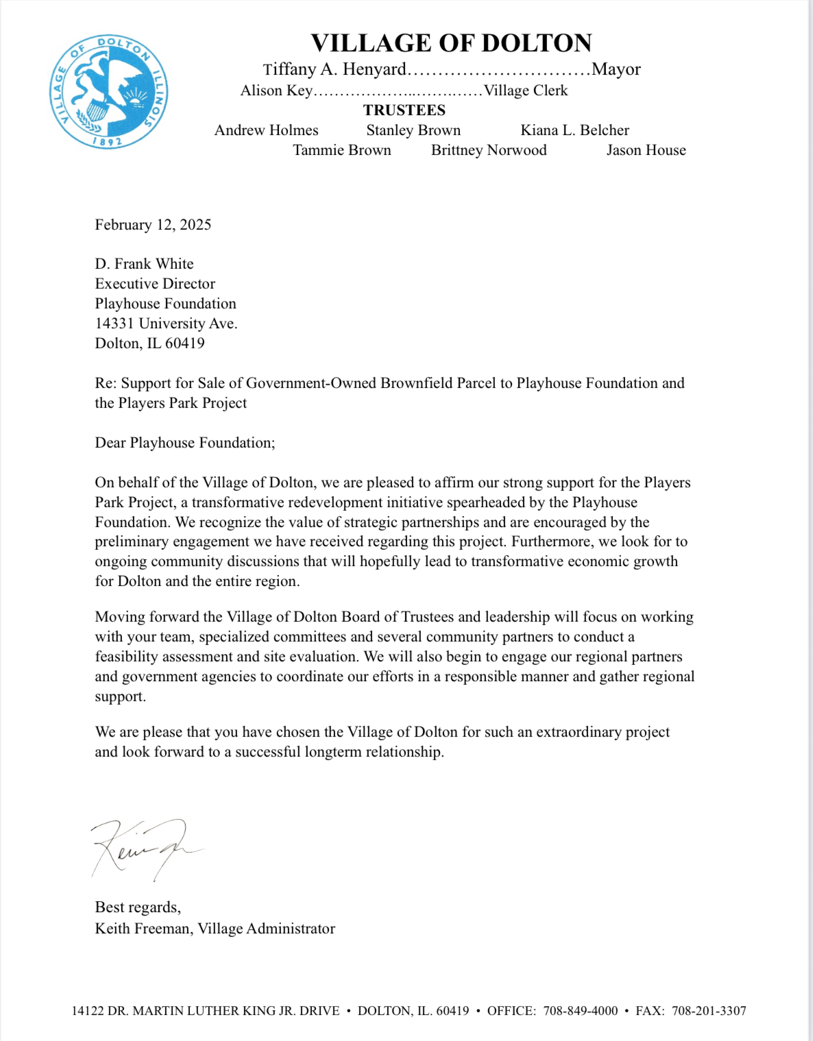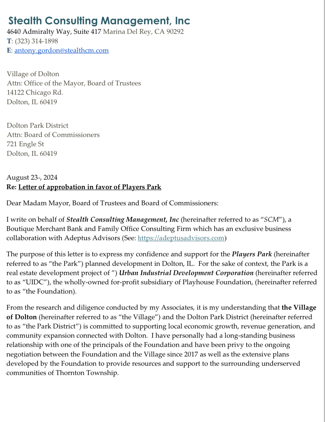 Players Park doesn’t replace community aspirations. It advances them, grounded in the principle that economic development is the foundation of community development, both of which are essential to stabilizing and growing Dolton’s economy for generations to come.