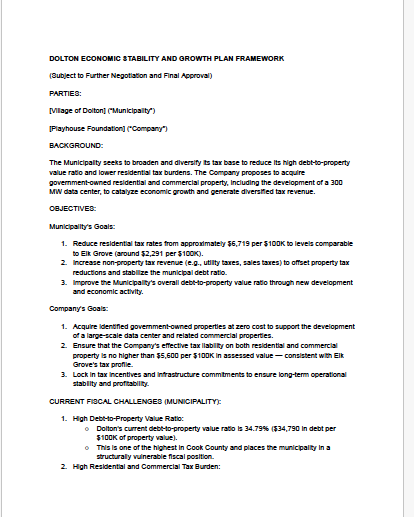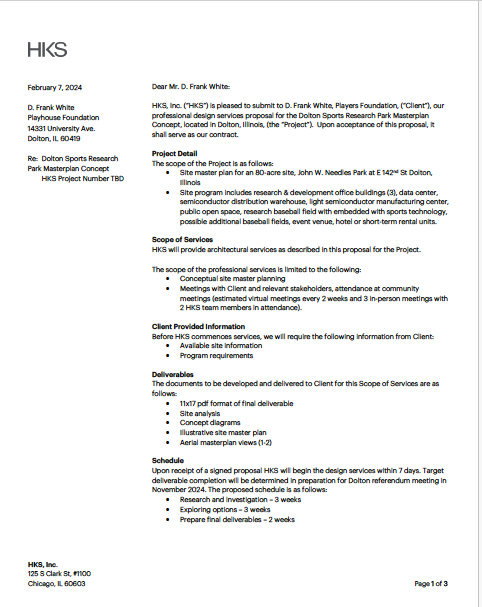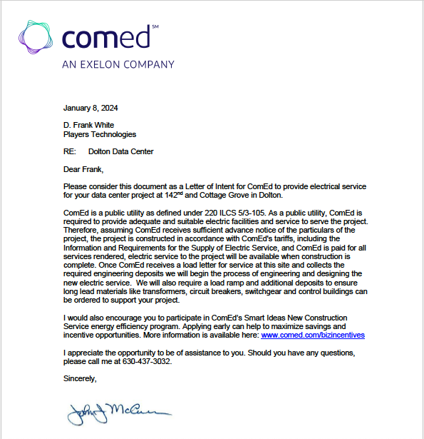 Those thresholds are no longer aspirational. Players Park Dolton was issued a letter of support signaling full public alignment. A 300MW will-serve letter confirms energy capacity. Players Technologies has granted intellectual property. A comprehensive master plan is underway with HKS, Inc. Philanthropic funding has been committed by the MLB Players Alliance. An institutional letter of approbation confirms pre-development readiness. The final layer is a finalized purchase agreement and preliminary permits to lock in equity and catalytic grant funding to initiate vertical construction and begin market-facing deployment.
